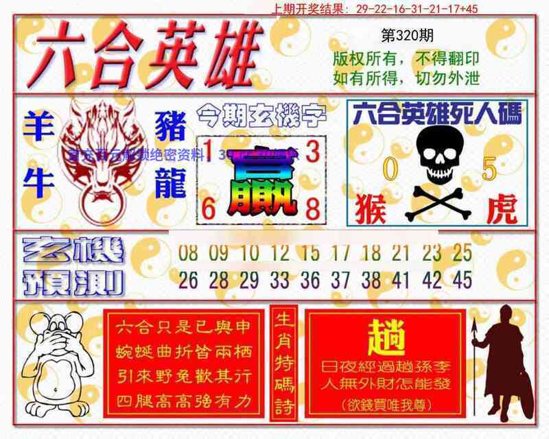 313期 今期生肖皆利字 珠机不离本期五 大门还是很不昏 吉人天相夺巧路 解译:大门还是很不昏指大肖牛马羊狗虎猪,吉人天相夺巧路指天肖牛马龙羊猴猪 九肖:牛马羊狗虎猪兔龙猴 特码:17.29.24.36.23.35.20.32 16.28.19.31.15.27.26.38 |